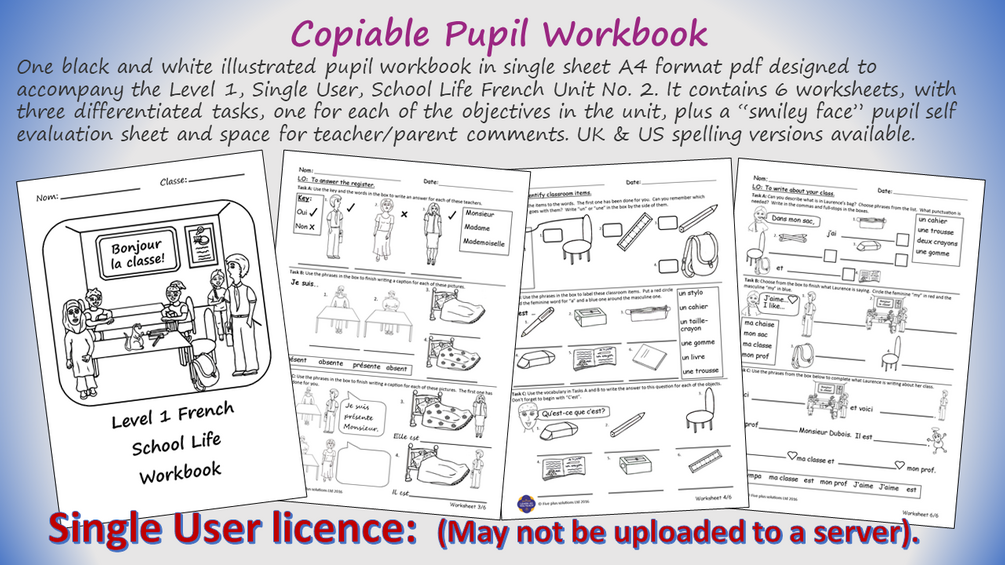An illustrated, black and white, primary/elementary French six worksheet copiable workbook designed to accompany the Level 1, Single User Licence of the School Life French Unit No. 2, (available separately) with 3 differentiated tasks. Age Range: (7-12). (UK Years 3-6: KS2) (US Grades 2-6) Worksheet Objectives include: 1. To understand instructions; 2. To tell time on the hour; 3. To answer the register; 4. To identify classroom objects; 5. To use numbers with classroom items; 6. To write about your class. There is an additional “smiley face” pupil self-evaluation sheet. It is supplied in two A4 single sheet pdfs one for UK users and one for US users.